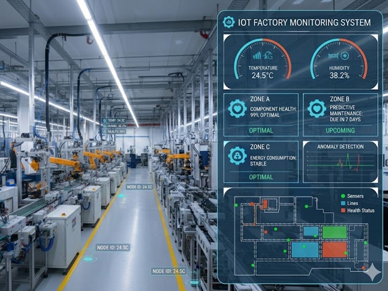 ✅ 系統架構示意與運作流程 感測層(IoT Sensor) 廠區各關鍵區域佈署溫濕度感測器,持續回傳數據。 通訊層(IoT Network) 使用可靠的物聯網協議(例如 LoRa、NB-IoT、802.11)輸送資料至集中伺服器或雲端平台。 平台層(Cloud / Edge) 整合數據庫、圖像化儀表板與 AI 分析模組,支援警報規則與自動控制邏輯。 應用層(管理端 & 行動端) 管理者可透過瀏覽器或 APP 實時查詢數據、收到警示、設定自動控制規則等。